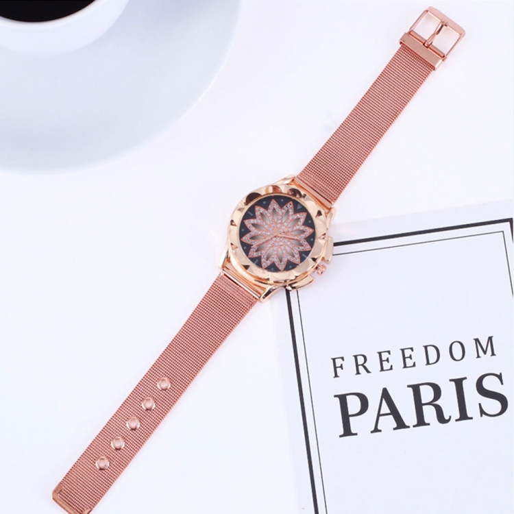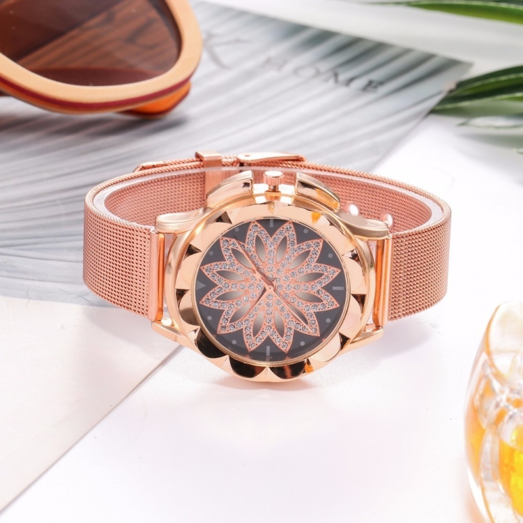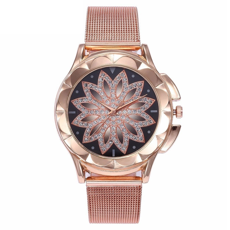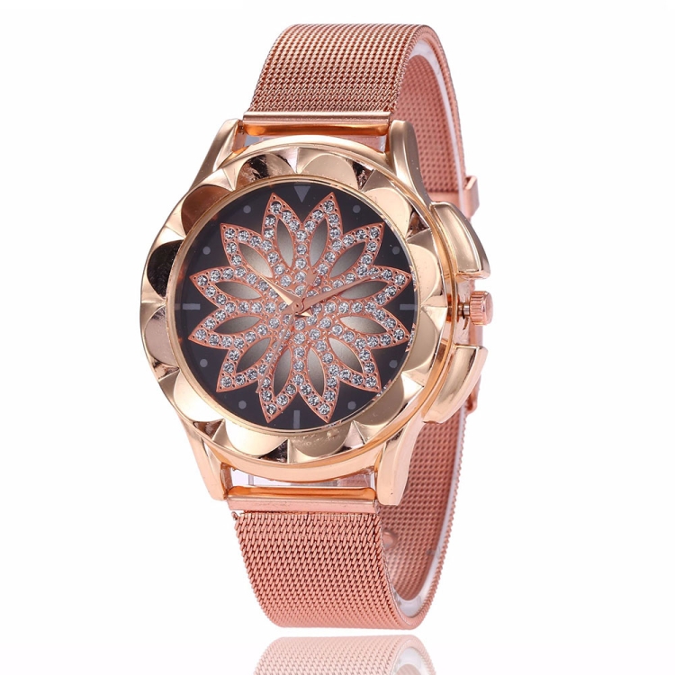 Smeeto Women Fashion Flower with Rhinestone Mesh Belt Alloy Bracelet Quartz Watch