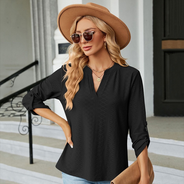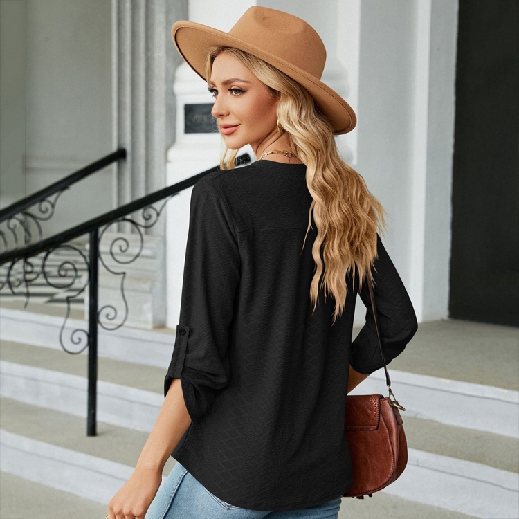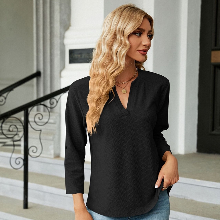 Solid Color Jacquard V-neck Button Three-quarter Sleeve Loose T-shirt Top