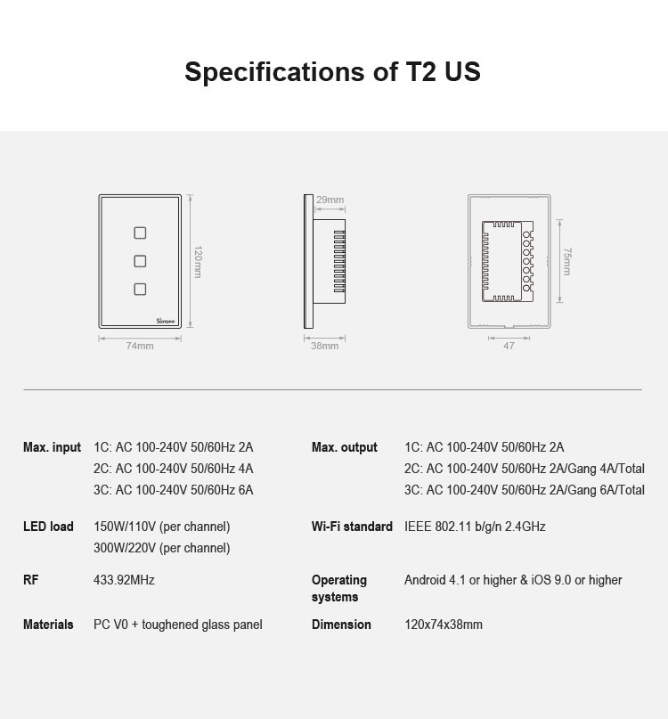 Sonoff T2 Touch 120mm Tempered Glass Panel Wall Switch Smart Home Light Touch Switch, Compatible with Alexa and Google Home, AC 100V-240V, US Plug