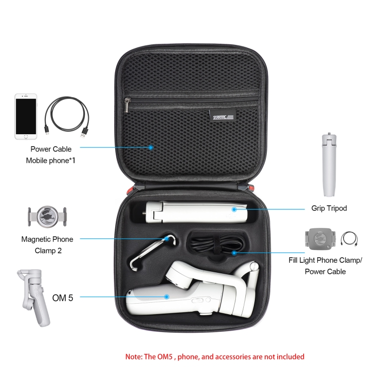 1. Specially designed for OM 5 handheld gimbal, precise mold opening, small size and large capacity, can store handheld gimbal, tripod + other small accessories at the same time