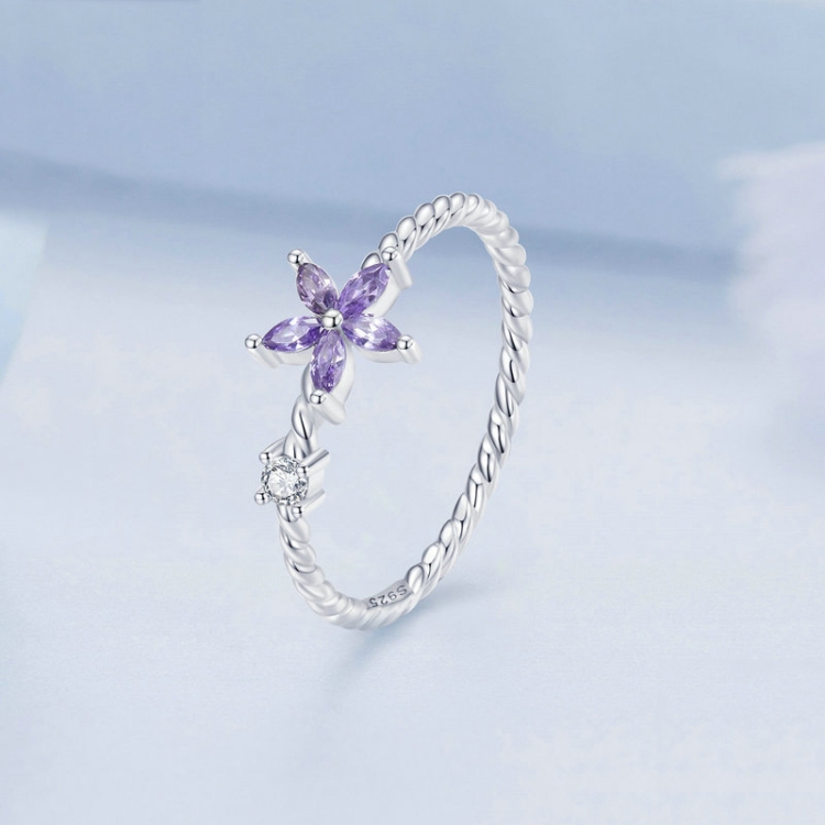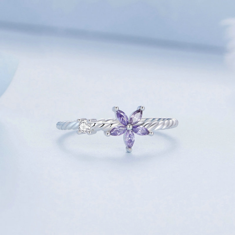 Sterling Silver S925 Geometric Zirconia Purple Flower White Gold Plated Ring
