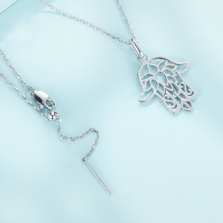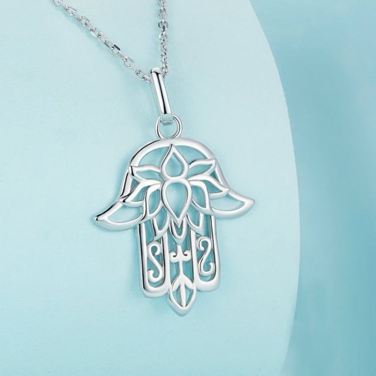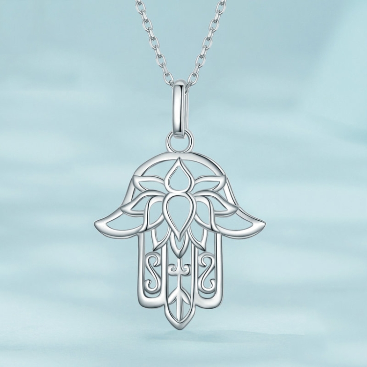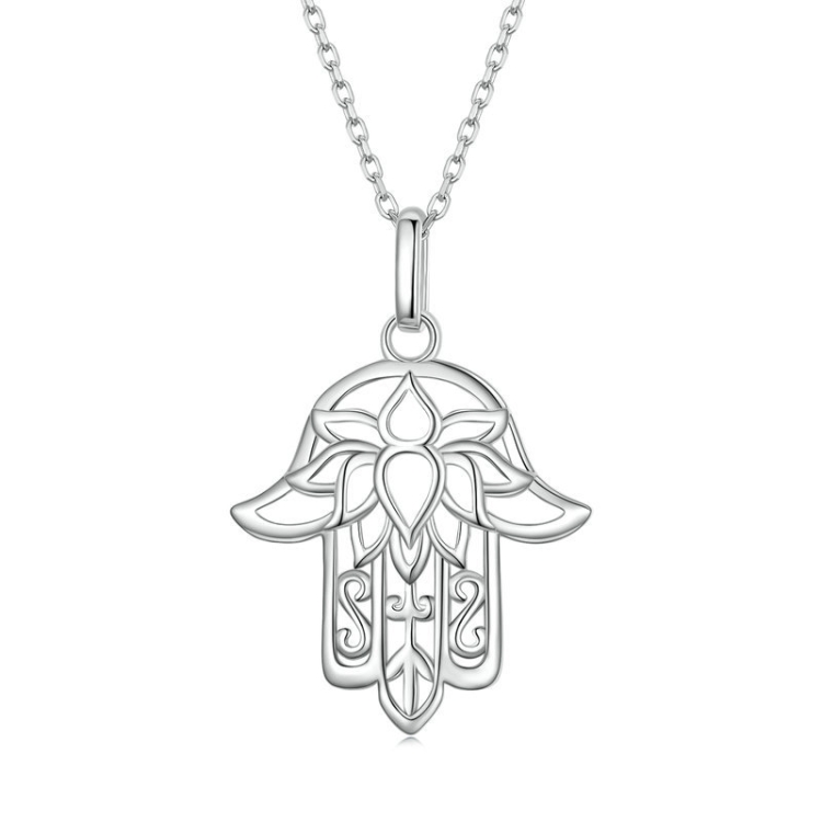 Sterling Silver S925 Hand of Fatima Hollow Lotus Plated Platinum Necklace