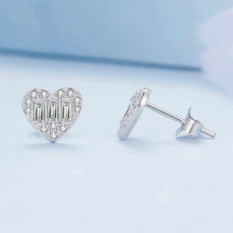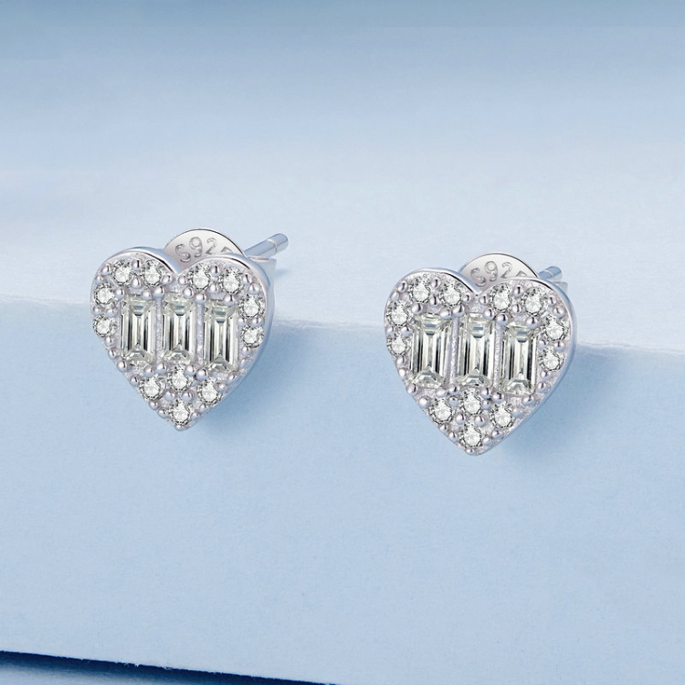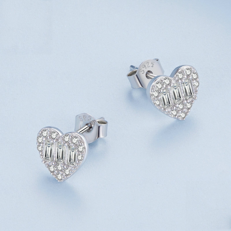 Sterling Silver S925 Plated Platinum Sparkling Zirconia Heart Stud Earrings