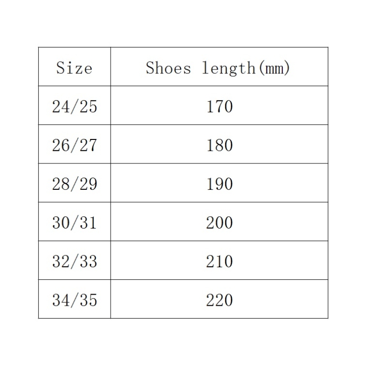 11. Size: 24/25 (170mm), 26/27 (180mm), 28/29 (190mm), 30/31 (200mm), 32/33 (210mm), 34/35 (220mm)