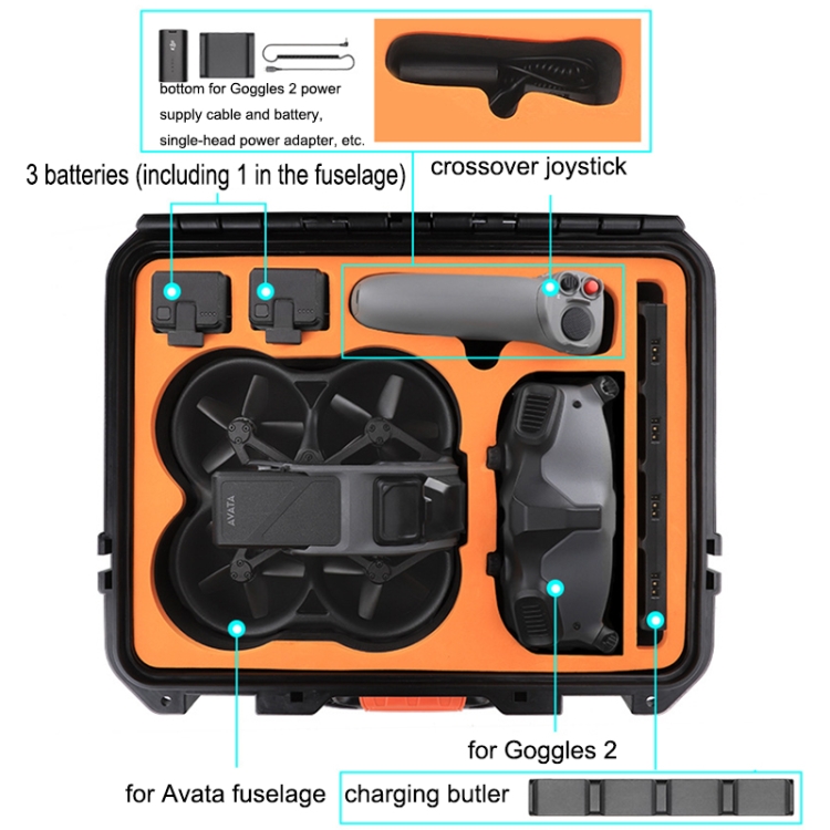 1. Practical and large capacity. Can accommodate for Avata fuselage, for Goggles 2, charging butler, crossover joystick, 3 batteries (including 1 in the fuselage), for Goggles 2 power supply cable and battery, single-head power adapter, etc.