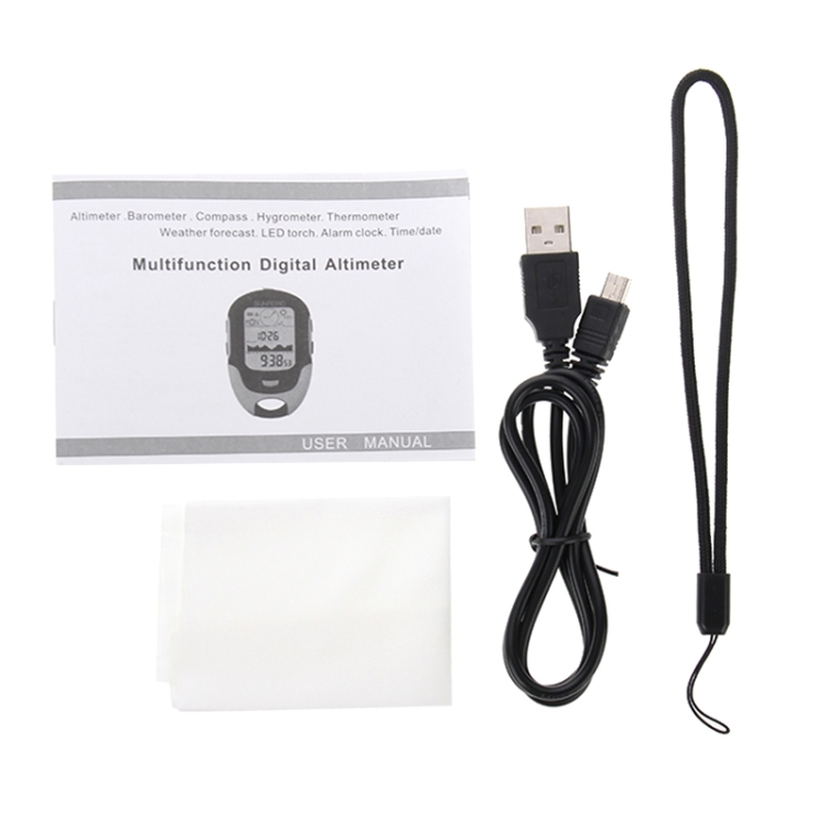 6. Incorporates altimeter, barometer, compass, Thermometer, hygrometer, time, date, alarm clock, LED torch functions, etc.