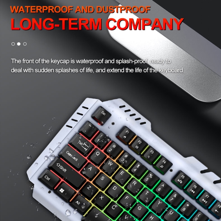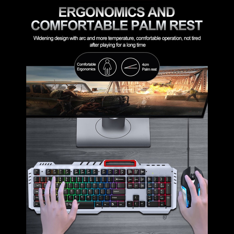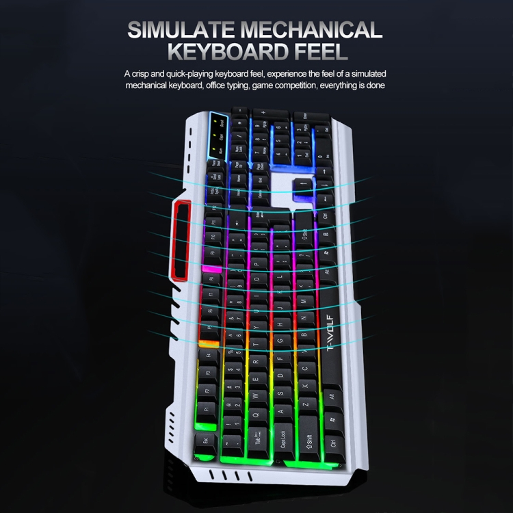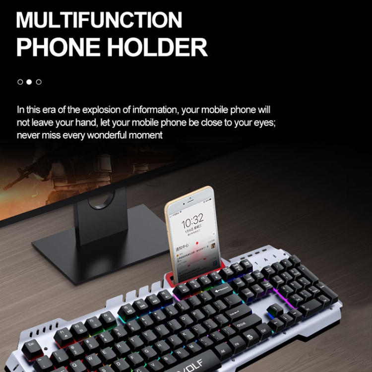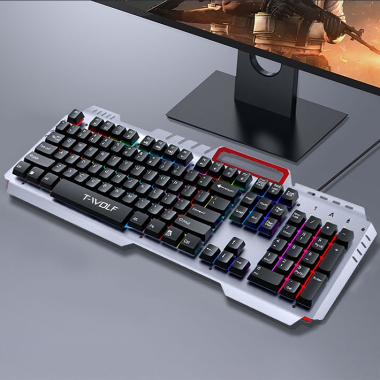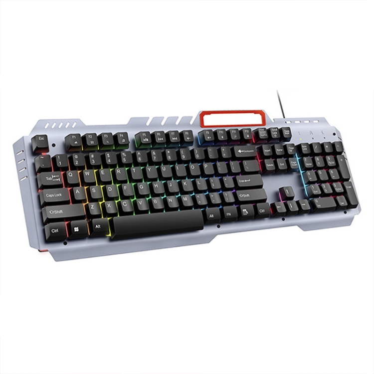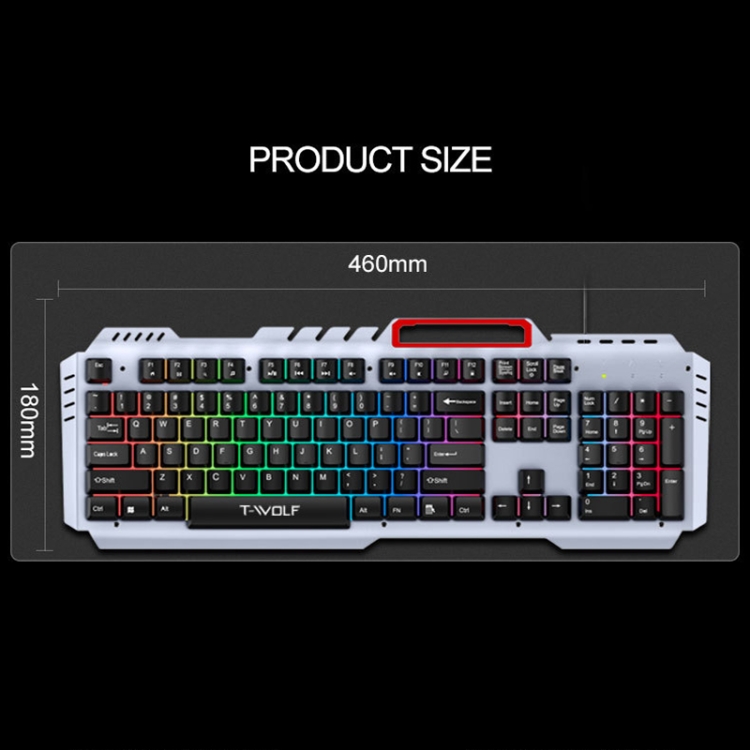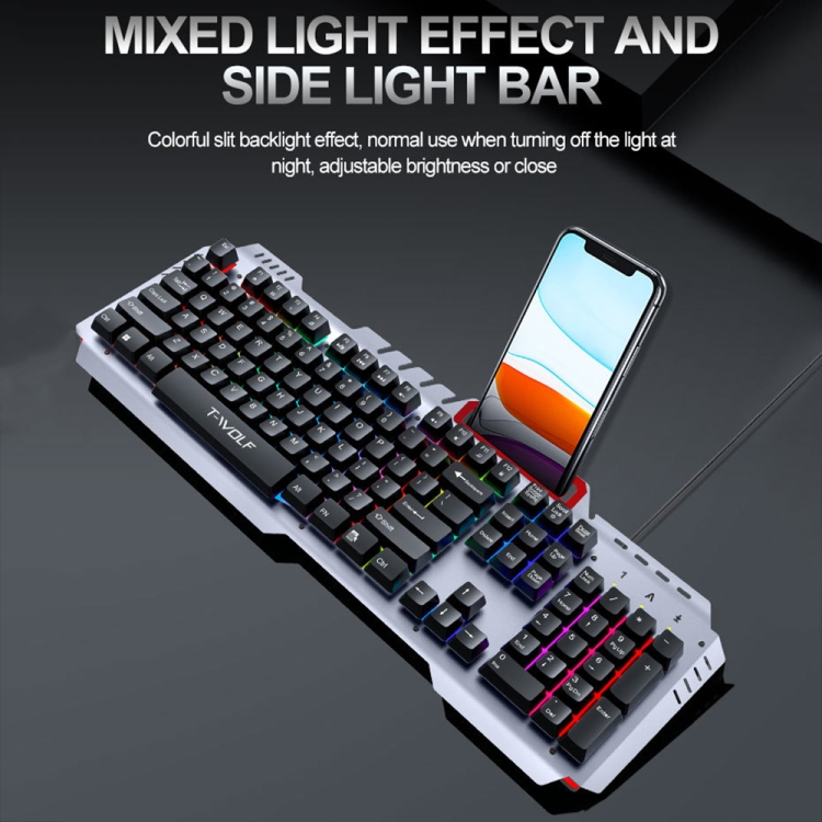 T-WOLF 130cm Line Length Cool Lighting Effect Metal Plate Gaming Wired Keyboard With Phone Holder