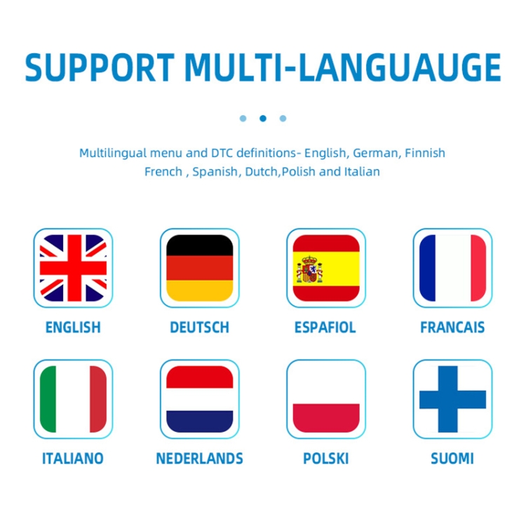 8. DTC definition with multi-language menu, support 9 languages: English, French, German, Italian, Spanish, Russian, Dutch. Finnish, Polish