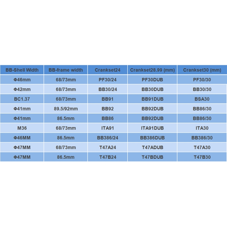 | Option | T47B24, T47A24, T47B30, T47A30, T47BDUB, T47ADUB, BB386, BB386 EVO, BB30, BB209, BB109, BB92, BB91, PF30 |