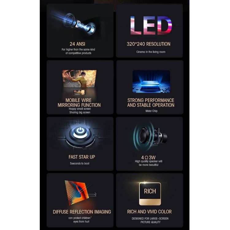 12. Input interface: AV / USB / TF / line mirroring / 5V 2A