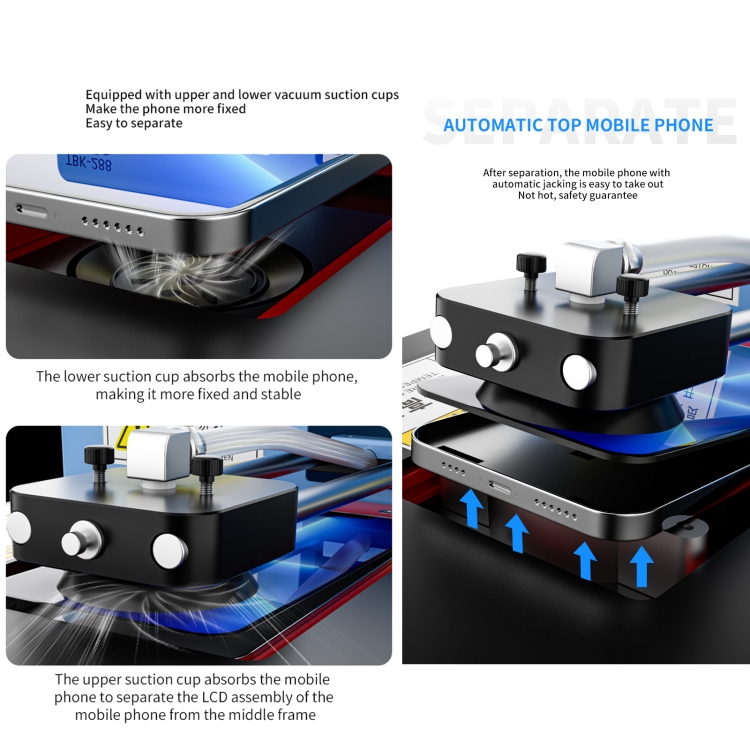 5. Built-in vacuum pump, strong vacuum pump sucks the mobile phone, the lower suction cup absorbs the Phone, making it more fixed and stable; the upper suction cup absorbs the Phone to separate the LCD assembly of the Phone from the middle frame.