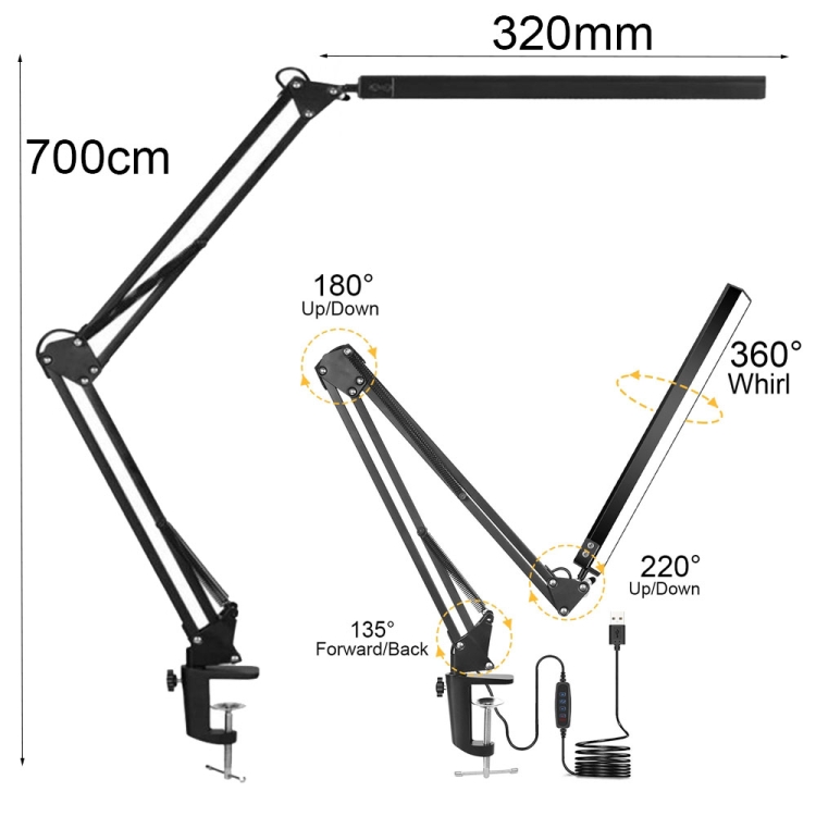 2. The lamp holder can be adjusted up and down 220 degrees and 360 degrees rotation, the telescopic arm can be adjusted 180 degrees / 135 degrees