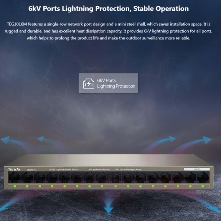 6. 6kV Ports Lightning Protection: It is rugged and durable, and has excellent heat dissipation capacity. It provides 6kV lightning protection for all ports, which helps to prolong the product life and make the outdoor surveillance more reliable