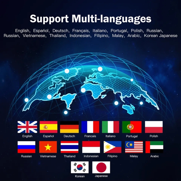 1. Supported languages: English, Simplified Chinese, Traditional Chinese, French, Spanish, Thai, Italian, Polish, Vietnamese, Russian, Malay, Portuguese, Arabic, German, Tagalog, Korean, Indonesian