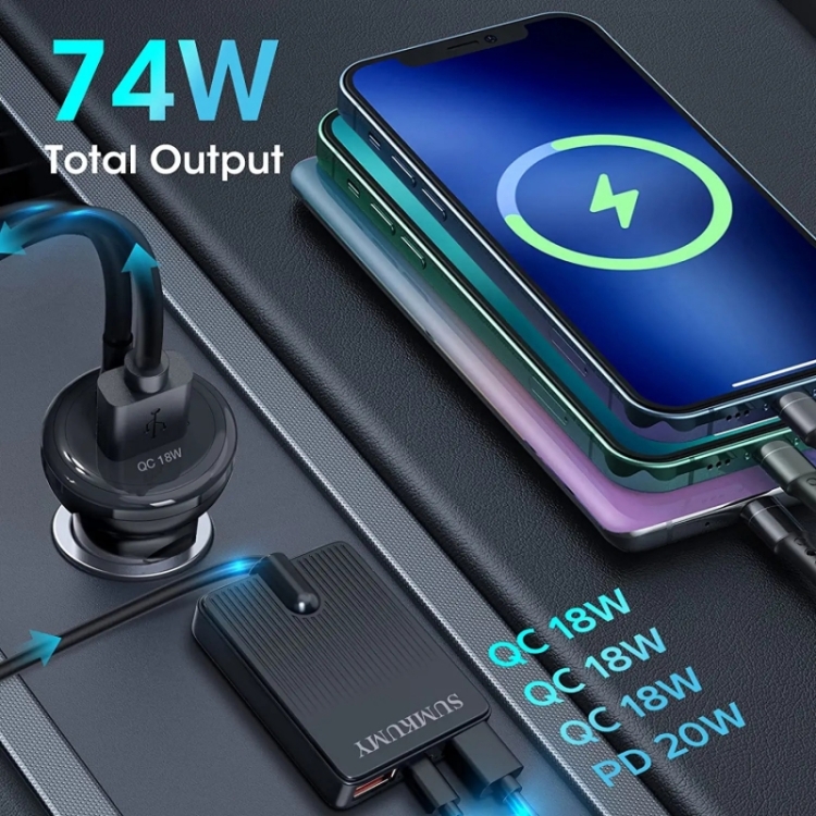 1.The rear seat extended car charger is designed with a Type-C, 3 USB ports