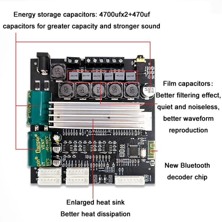1. Energy storage capacitors: 4700ufx2+470uf capacitors with larger capacity and stronger sound