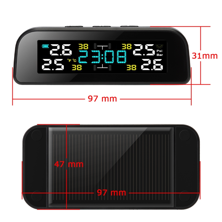 5. Built-in solar panel and USB interface, the wireless TMPS receiver can be charged via USB or sunlight to ensure continuous operation of the tire pressure monitoring system.