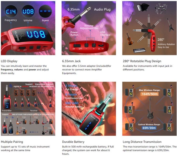 U12DX 6.35mm Jack Wireless Guitar Transmitter Receiver Rechargeable Adapter