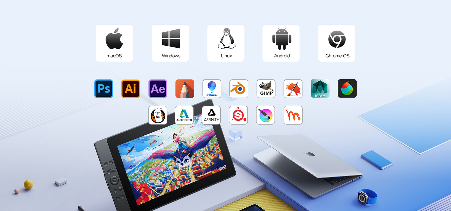 UE16 Drawing Monitor is compatible with Windows, Mac OS, Linux, and Chrome OS. It also works well with Android devices (USB3.1, DP1.2)and popular drawing software.