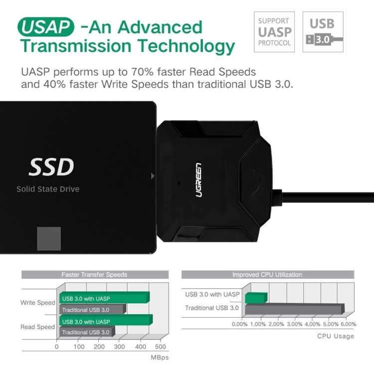 3. This usb sata adapter supports UASP Technology, which is 70% Faster than traditional USB 3.0 and 80% reduction in required processor resources, which enables you to utilize the full potential of your SATA III SSD/HDD, when paired with a UASP-enabled host controller. The UASP Transfer Protocol only can accelerate read and write speed of SSD hard disk.