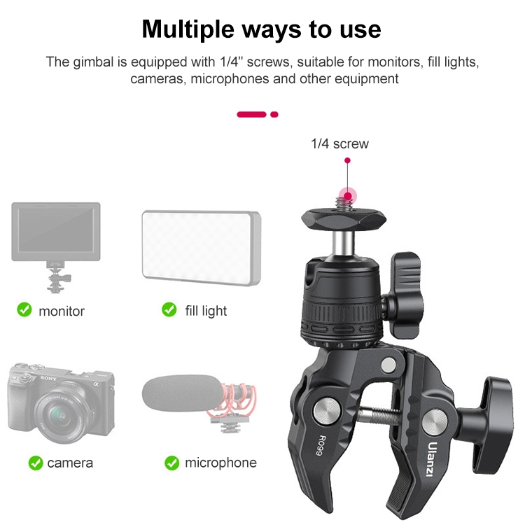 4. A variety of ways to use, the gimbal is equipped with 1/4 inch screws, suitable for monitors, fill lights, cameras, microphones and other equipment