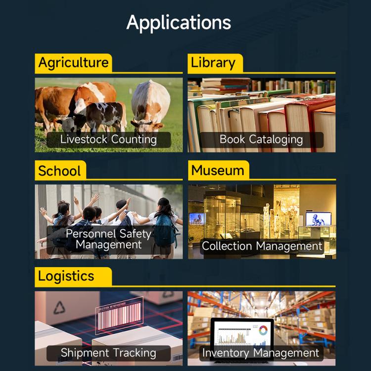 4. Application: widely used in agriculture, libraries, schools, museums, personnel safety management, retail, logistics, healthcare, tool management, safety management, etc.