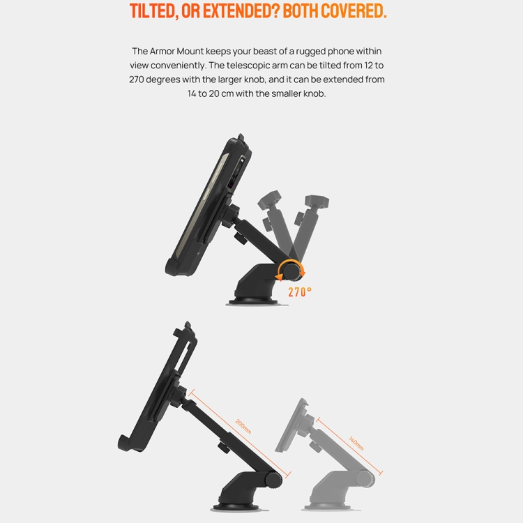 4. It keeps your beast of a rugged phone within view conveniently. The telescopic arm can be tilted from 12 to 270 degree with the larger knob, and it can be extended from 14 to 20cm with the smaller knob.