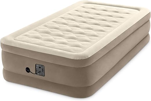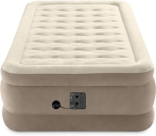 Ultra Plush Fiber-Tech 18 Inch High Twin Inflatable Airbed Elevated Air Mattress with Built-in Pump & Flocked Top, Tan