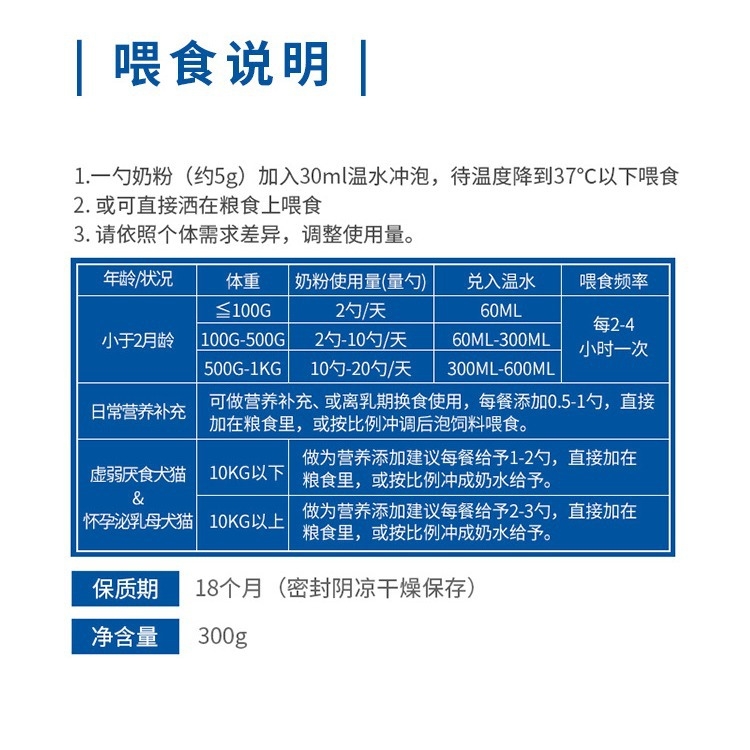 5. Feeding method: add 60ml of warm water for every 10g of milk powder (about 2 scoops) and wait until the temperature drops to about 37 degrees Celsius before giving; or directly sprinkle it on the food