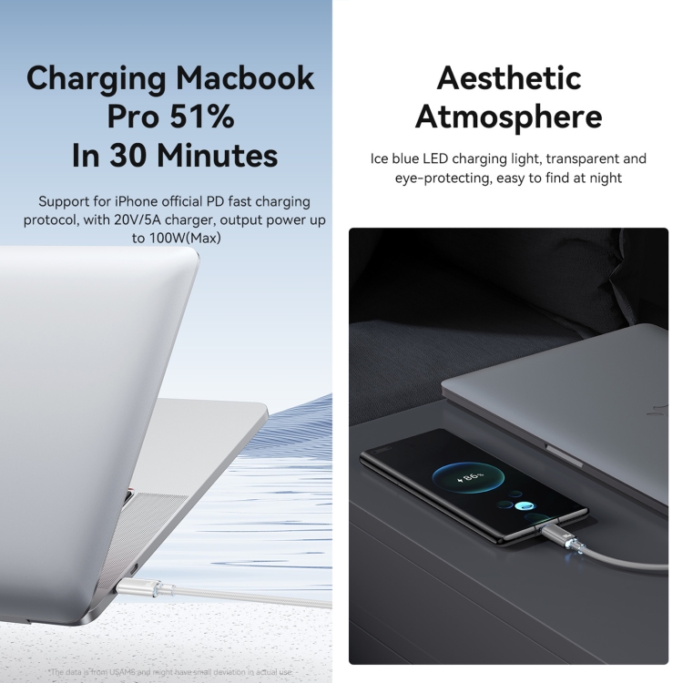 USAMS Type-C To Type-C Aluminum Alloy Clear LED 100W Fast Charge Data Cable, Length:1.2m