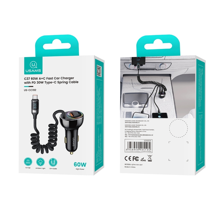USAMS US-CC192 C37 60W Type-C+USB Dual Port Car Charger with Digital Display 30W Type-C Spring Data Cable
