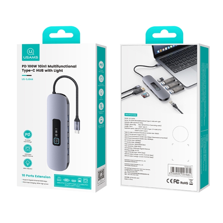 USAMS US-SJ644 PD100W 10 in 1 Aluminum Alloy Multifunctional Type-C HUB with Light