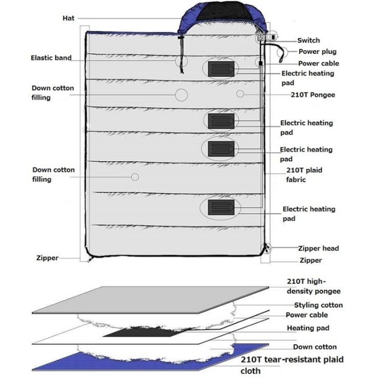 1. Sleeping bag that can be heated, 3 temperature adjustable (40-45 degrees Celsius / 45-50 degrees Celsius / 50-55 degrees Celsius)