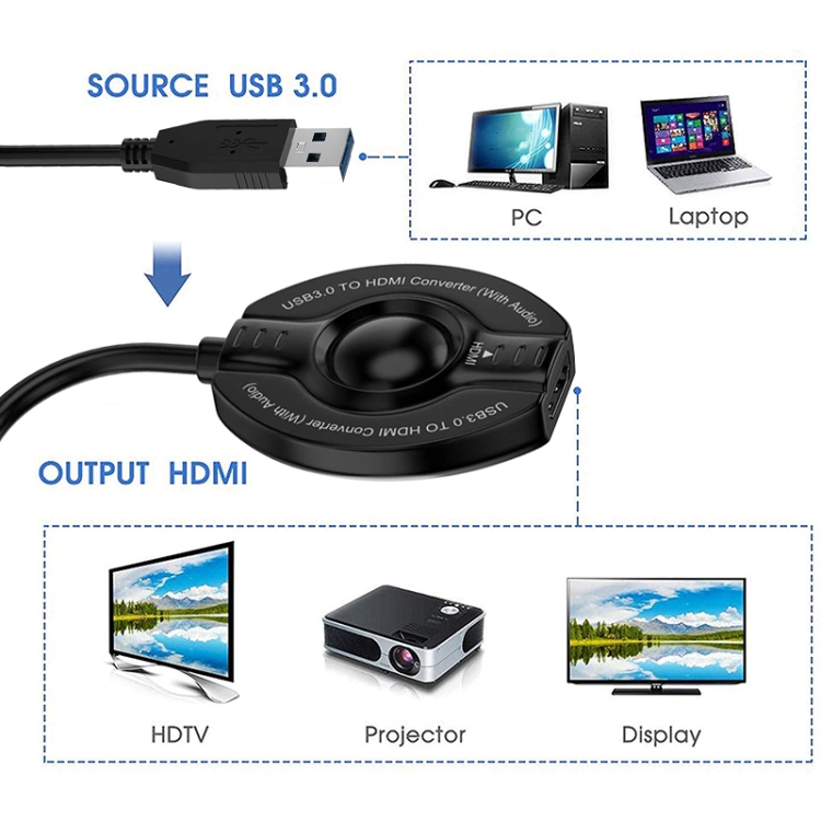 5. Adopt digital conversion chip, built-in audio, convert USB signal to HDMI signal, without any technical processing such as reduction and amplification of the signal, HDMI output supports 1080P/60Hz.