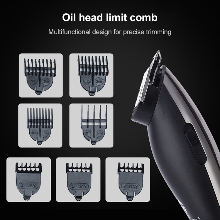 12. Accessories: power adapter, push white blade x1, U-shaped blade x1, engraving blade x1, limit comb x4 (15/3/6/9M), limit comb x3 (3/5/7MM), Cleaning brush x1, cutter head protection cover x1, manual x1