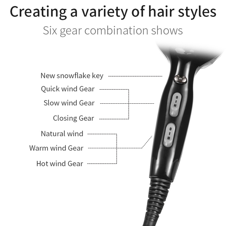 9.Strong airflow, brand new tuyere design, with 2200W power, bring greater air volume, and dry your head in the time of a song