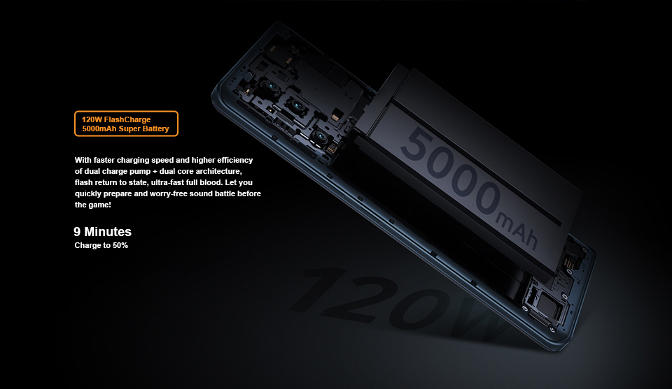 Charging specifications: 120W ultra-fast flash charging, support maximum input charging specification 20V/6A, compatible with 20V/4A, 20V/3.3A, 11V/5A, 11V/4A, 11V/3A, 10V/2.25A, 9V/2A or 5V/2A