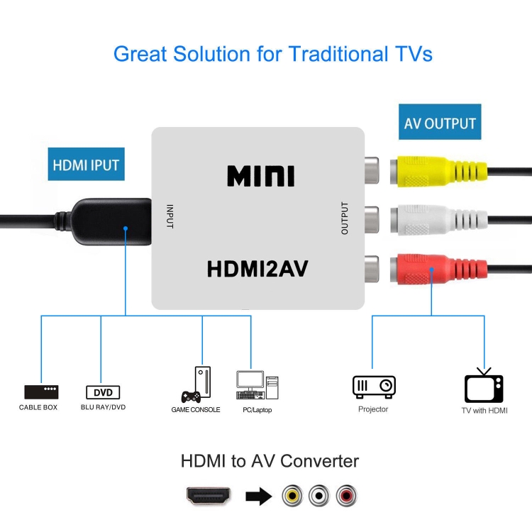 * The MINI HDMI2AV signal converter which will convert HDM video signal or audio signal to AV (CVBS) composite video signal and the FL / FR stereo audio signals, while support DVI system sideline signals. Help users convert the high quality of the HDMI video signal into normal CVBS signal (standard-definition 480i, 576i,).So that can play on TV, VHS VCR, DVD recorders, etc. Support NTSC and PAL two TV format.