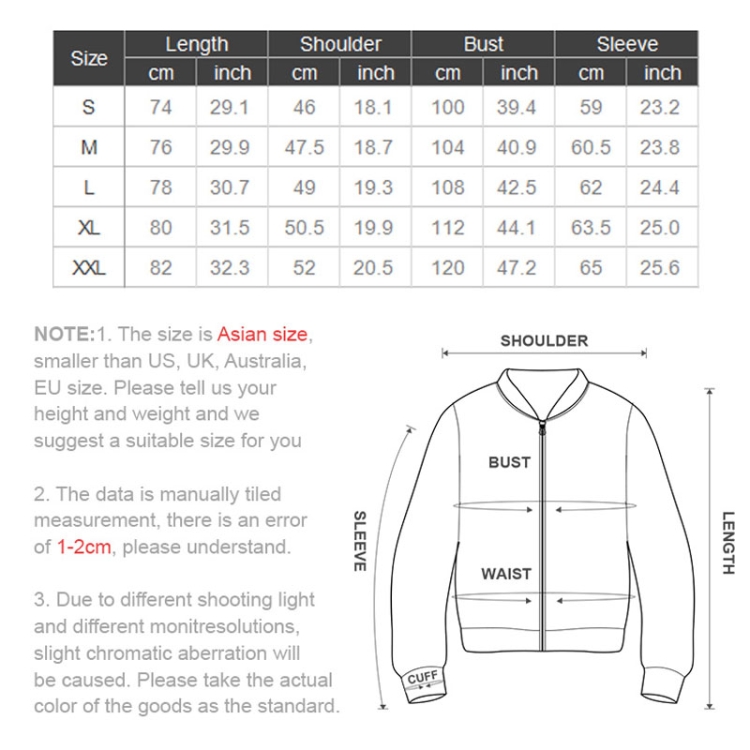 | Size | Clothes Length | Shoulder Width | Chest | Sleeve Length | ||||