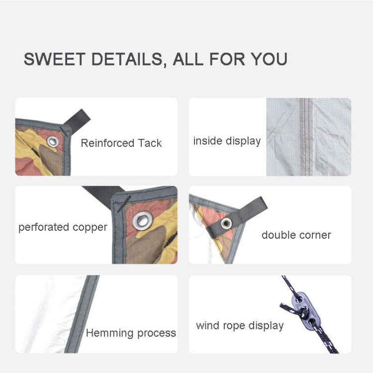 7. Product material: 210T tear-resistant polyester camouflage plaid + PU2000 water pressure waterproof + silver-coated sunscreen