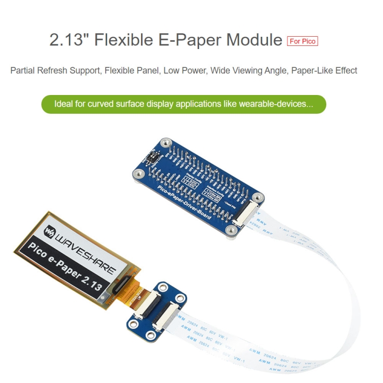 Waveshare 2.13 inch 212 x 104 Pixel Black / White Flexible E-Paper E-Ink Display Module for Raspberry Pi Pico, SPI Interface