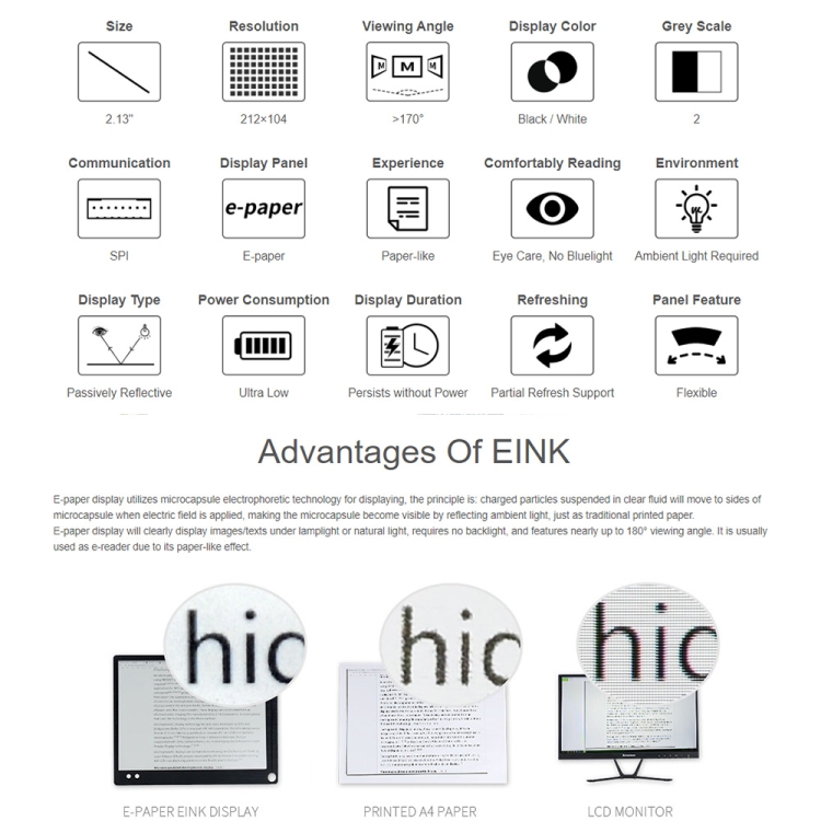 1. E-paper display utilizes microcapsule electrophoretic technology for displaying, the principle is: charged particles suspended in clear fluid will move to sides of microcapsule when electric field is applied, making the microcapsule become visible by reflecting ambient light, just as traditional printed paper.