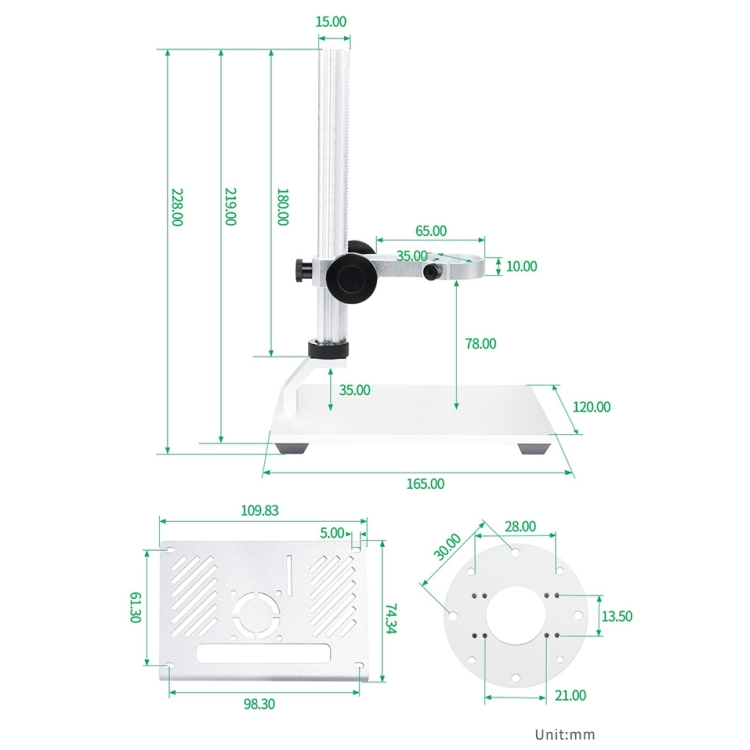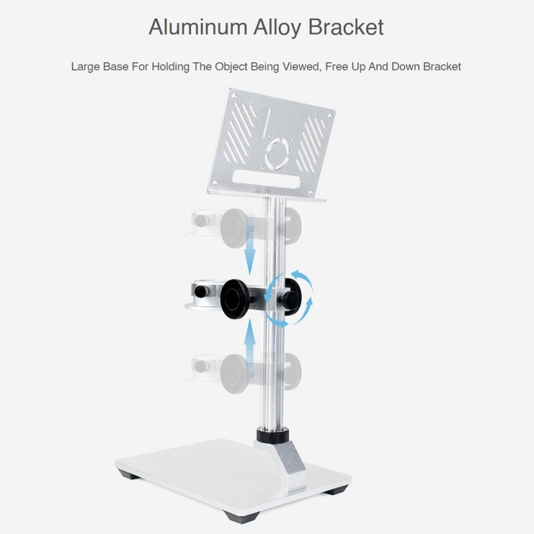 Large base for holding the object being viewed, free up and sown bracket