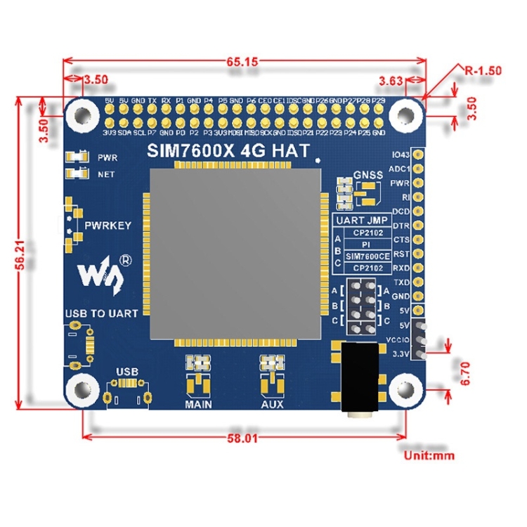 | Option | 4G / 3G / 2G / GSM / GPRS / GNSS HAT, 4G / 3G / GNSS HAT, NB-IoT / eMTC / EDGE / GPRS / GNSS HAT, NB-IoT HAT, GSM/GPRS/GNSS/Bluetooth HAT, A7670E LTE Cat-1 HAT |