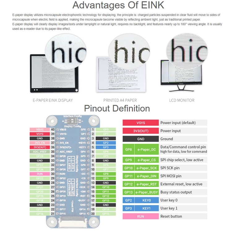 1. E-paper display utilizes microcapsule electrophoretic technology for displaying, the principle is: charged particles suspended in clear fluid will move to sides of microcapsule when electric field is applied, making the microcapsule become visible by reflecting ambient light, just as traditional printed paper.