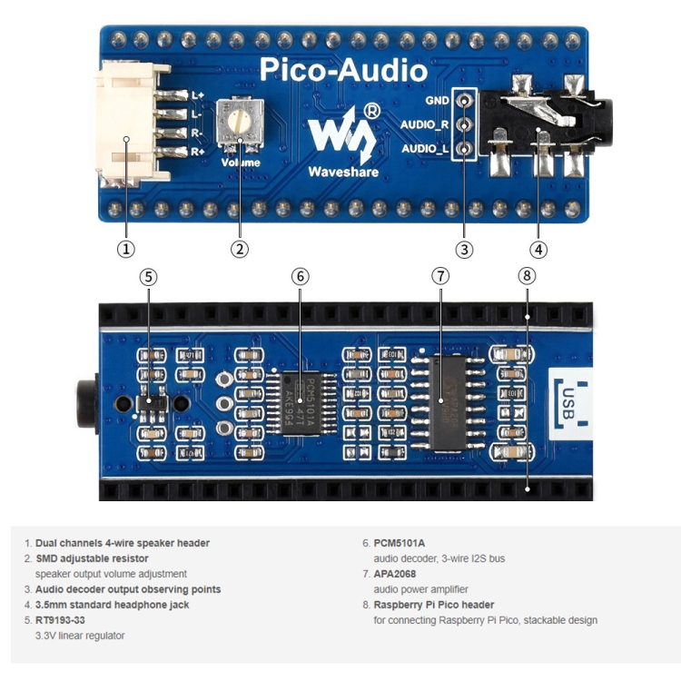 7. Come with development resources and manual (Raspberry Pi Pico audio play code, sound card code)