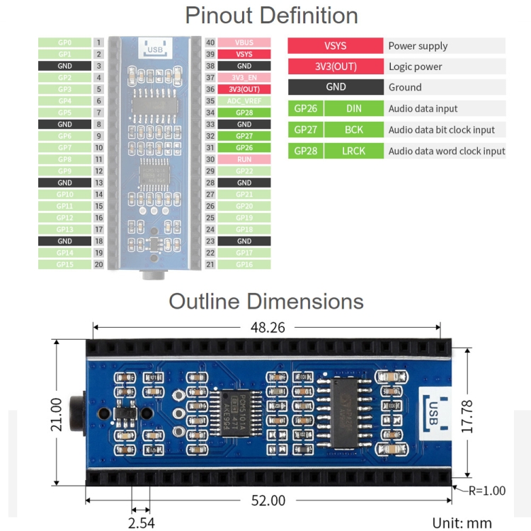 The Pico-Audio is an audio expansion module designed for Raspberry Pi Pico, which incorporates PCM5101A low power stereo decoder, and uses I2S bus for transmitting audio signal. It supports wide range audio sampling rate, allows headphone and speaker signal output at the same time.