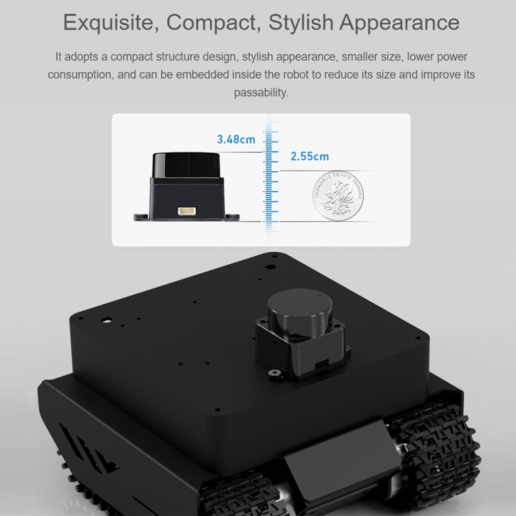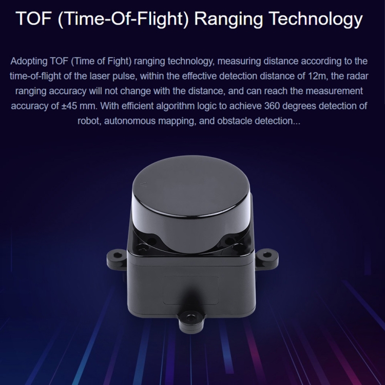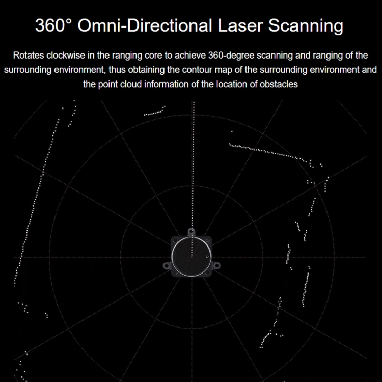 LD19 is mainly composed of laser ranging core, wireless transmission unit, wireless communication unit, angle measuring unit, motor driving unit, and mechanical housing.The LD19 ranging core adopts DTOF technology to measure 4500 times each second. When it works, LD19 emits the infrared laser forward, the laser is reflected to the single photon receiving unit after encountering the target object. Thus, we get both time of laser emitting and receiving, the gap between them is time of flight. With the light speed, we can calculate the distance.After receiving distance data, LD19 will combine them with angel value getting from angle measurement unit to comprise the points cloud data, then transmitting the points cloud data to external interface via wireless communication. Meanwhile, the external interface provides PWM to allow the motor driving unit to drive the motor. After the external control unit gets the rotational speed , it will reach to specified speed through PID algorithm closed-loop control to ensure LD19 work stably.
