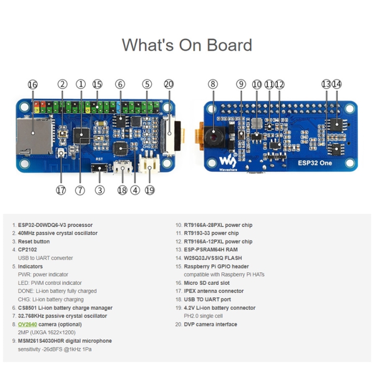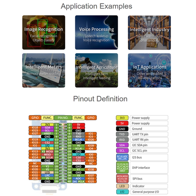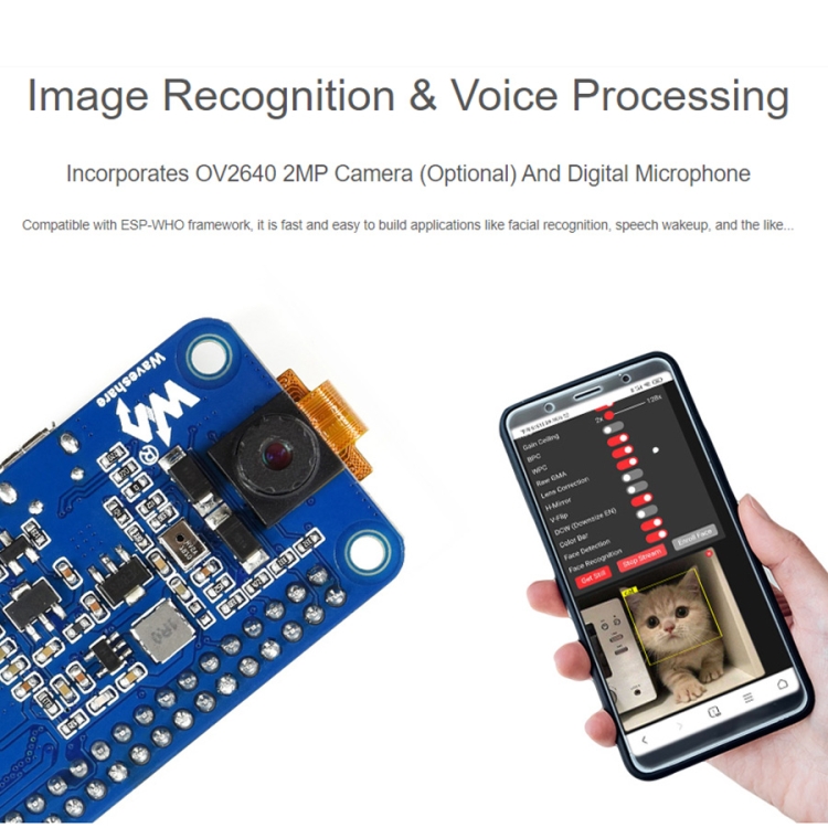 1. OV2640 camera and digital microphone, supports applications like image recognition, voice processing…