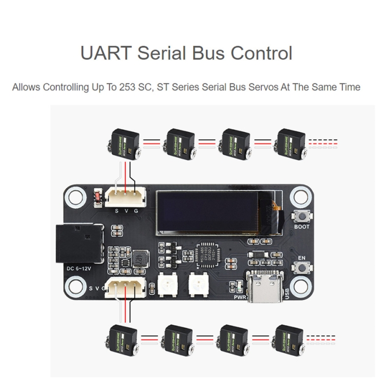 1. Allows controlling up to 253 SC, ST series serial bus servos at the same time (adequate power supply required)